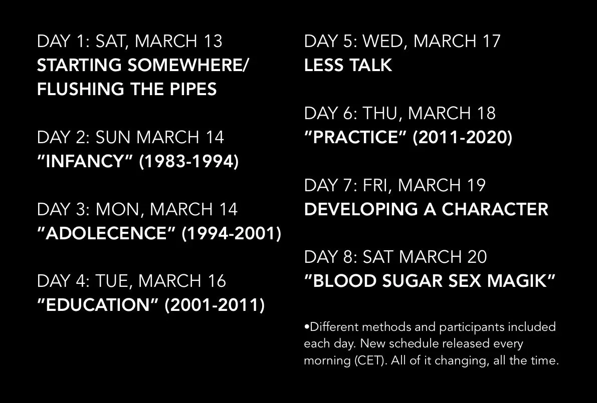 FAULTY CHANNELS, Pt. 0: “Kindly Remind Me of My Presence” (2021) was a week-long, live streamed open studio that took place at Inkonst in Malmö, Sweden. It is the first installment in an ongoing performance auto-biography investigating memory and forgetting.